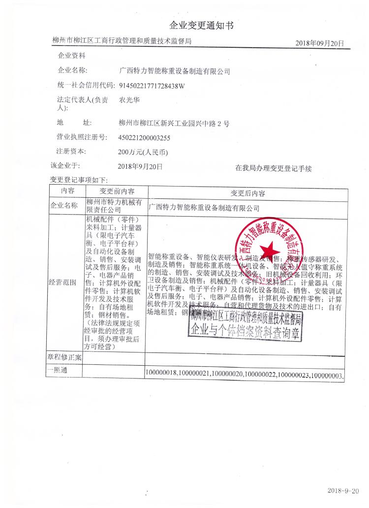 從2018年9月20日起,將原公司名稱“柳州市特力機械有限責任公司”變更登記為“廣西特力智能稱重設備制造有限公司”。公司稅務方面相關變更事宜正在辦理,在辦理完結前公司無法開票,待辦理完結,公司另行通知各位。公司更名后,業務主體和法律關系不變,原簽訂的合同繼續有效,原有的業務關系和服務承諾保持不變。